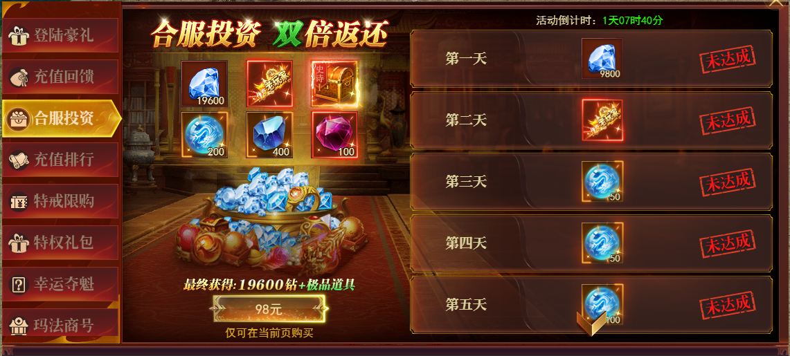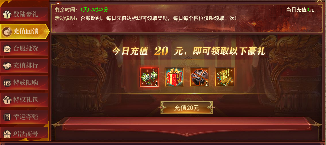 合服期间,每日充值达标即可领取奖励,每日每个档位仅限领一次!