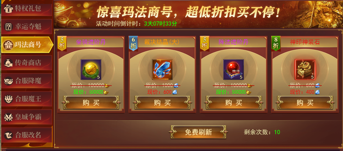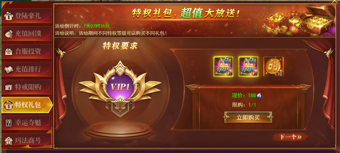 活动期间不同特权等级可以购买不同礼包,限时超低折扣,超值大放送。