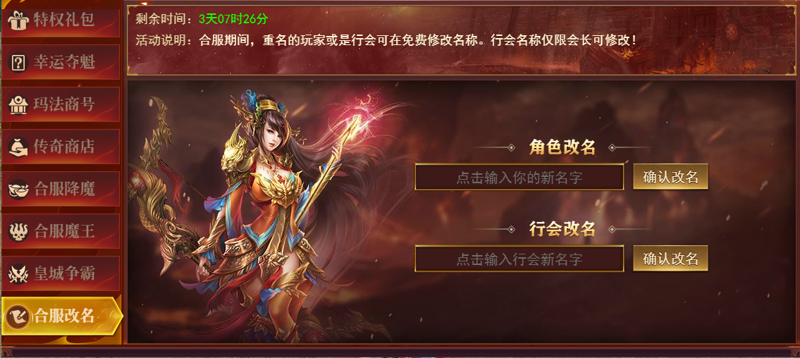 合服期间,重名玩家或是行会会长可以在此免费修改名称,行会名称仅限会长修改!