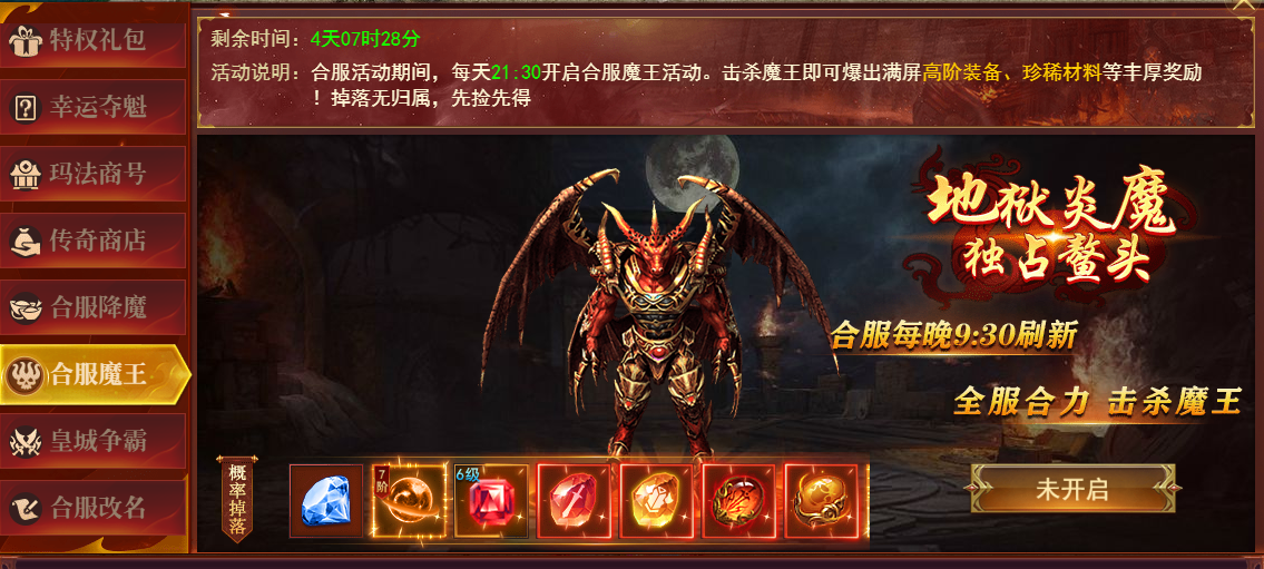 合服活动期间,每天21:30开启合服魔王活动,击杀魔王即可爆出高阶装备、珍稀材料等丰厚奖励!掉落无归属,先捡先得。
