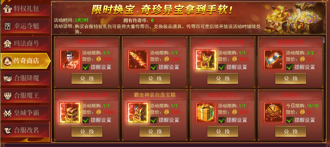 活动期间可使用传奇币在商店限时兑换各种珍贵道具,奇珍异宝拿到手软!