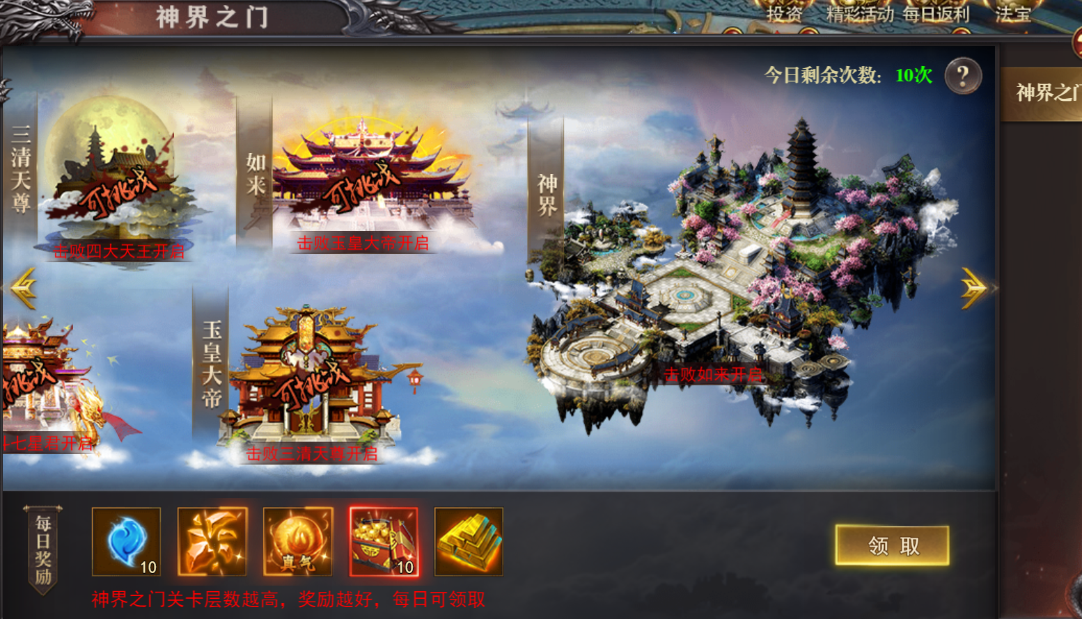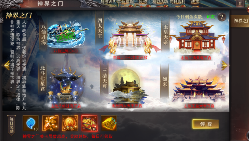 (1)神界之门每日有对应的关卡奖励,关卡层数越高,奖励越好