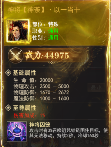 (1)神将囚笼: 攻击时有概率召唤诅咒锁链困住目标,使其无法移动,持续2秒