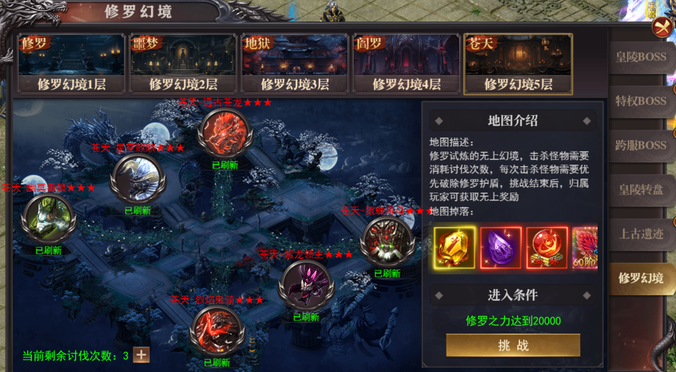 1.副本每天可以挑战3次(修罗之力达到对应数值才可以进入副本)开通修罗特权,即可增加修罗幻境每日讨伐次数+1