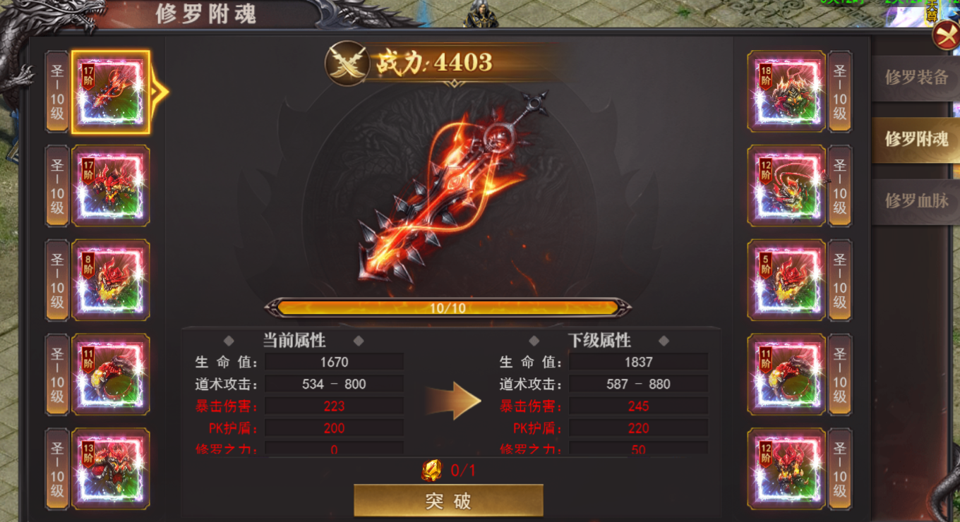(2)附魂需要修罗附魂石,附魂达到一定等阶需要附魂突破石进行突破