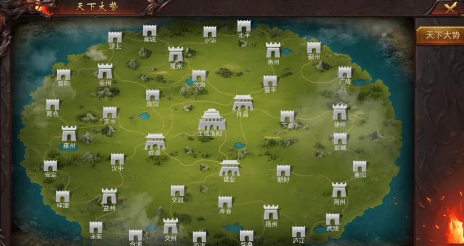 当攻城掠地的界面打开后,我们可以看到一个3星级的城市,这个城市就是我们的主城。主城是无敌的,我们的目标是抢占位于中心位置的王城洛阳。周一我们只能攻打2星级的城市,而到了周四和周六,我们就可以攻打4星级的城市,周日目标直指洛阳。
