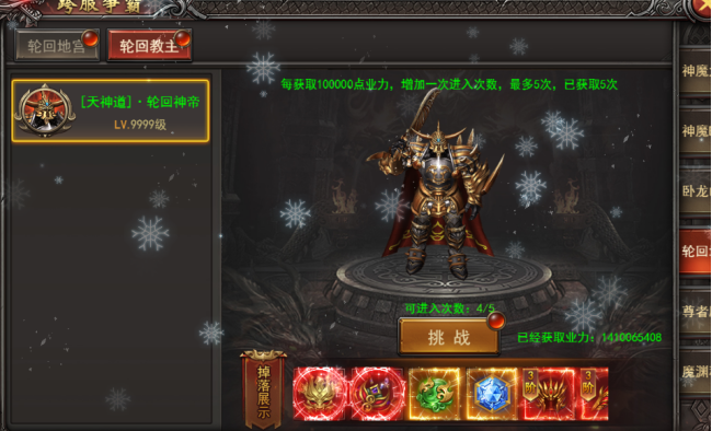 (1).新地图--轮回教主副本:每日获取一定业力,增加一次进入次数,每日最多3次,产出轮回圣装、轮回宝钻、勾玉等装备材料