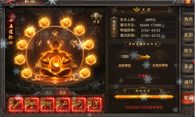 (2).轮回圣装--穿戴:通过轮回地宫,轮回副本产出,也可通过材料合成,集齐一套,可激活圣装套装技能,pvp生效