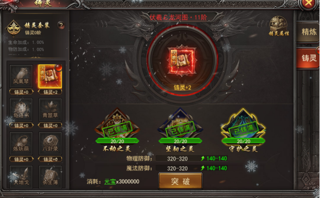 (3)注灵突破:同部位3个注灵满级后可突破注灵,突破后注灵等级提升1阶