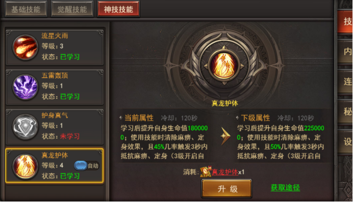 3. 新增--通用神技真龙护体,增加生命,使用技能时清除麻痹、定身状态,并有几率触发真龙护体,免疫麻痹、定身3秒,技能等级越高,真龙护体触发几率越大,3级时自动开启释放;