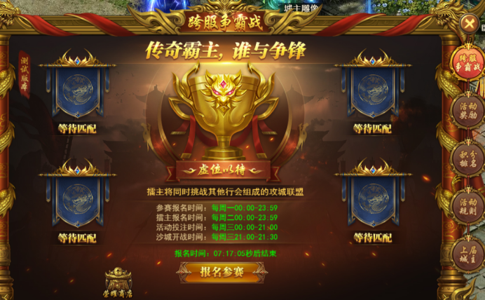 1. 新增--跨服沙城争霸战,开服60天开启,且满足7天内有超过5个15转以上成员登录过游戏的行会可报名;