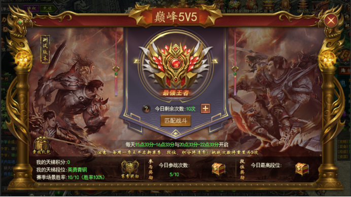 1. 新增玩法--5v5巅峰赛:开服60天后,替换1v1巅峰赛,每天11:00-11:30、21:00-21:30开启活动;
