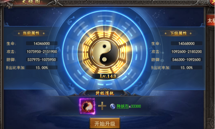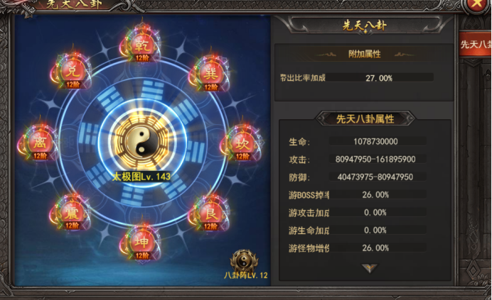 3. 新增玩法--西游养成--先天八卦升级:穿戴一套八卦装备可激活太极图,使用太极印可对太极图进行升级,等级越高,属性加成越高,可以带出西游属性比例越高;