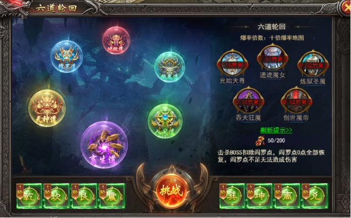 4. 新增地图--西游养成--六道轮回:达到对应的先天八卦阶数可进入对应地图,击杀boss需要消耗阎罗令;