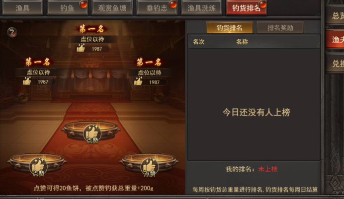 a. 每周记录钓鱼的总重量,并进行排名,排名奖励每周日晚上0点结算,邮件发放;