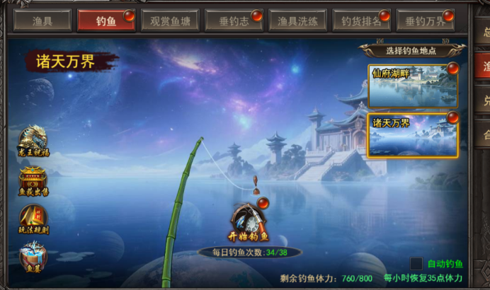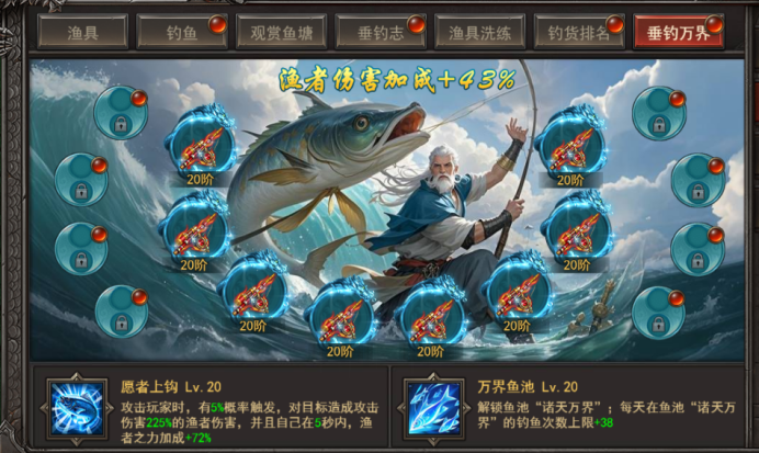 b. 专属技能-万界鱼池:解锁诸天万界鱼池,增加钓鱼次数上限,等级越高,上限次数越高;