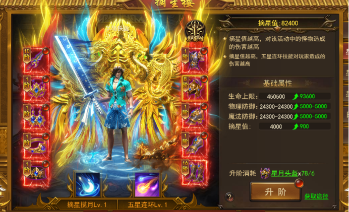 d. 专属技能:摘星揽月(激活1阶5件套)--攻击时有概率触发,对摘星楼活动中的boss,造成一定的生命上限攻击伤害,技能等级越高,效果越强;