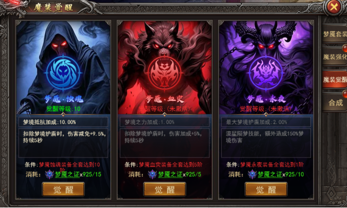 a. 对应梦魇套装达到5阶后可使用材料进行觉醒