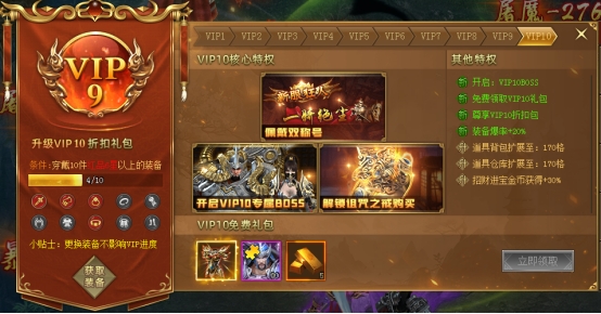 游戏内穿戴指定品质整套(10件)装备即可升级VIP