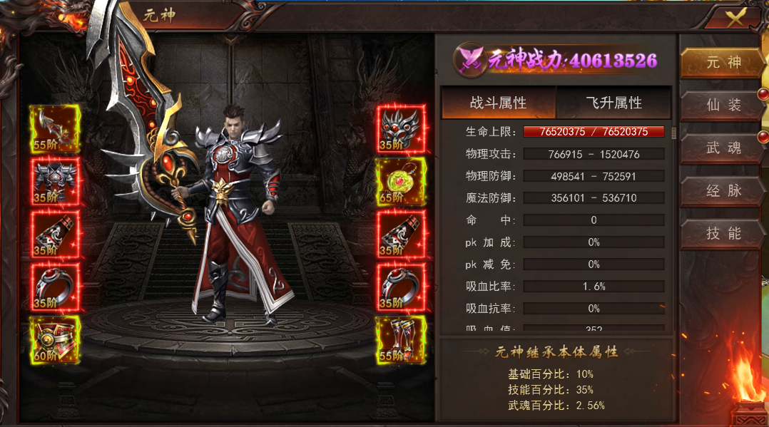 元神武魂也是一个重要地方,因为武魂升级能够增加继承人物属性的百分比,这里会消耗大量的元宝,建议大家可以建个小号给自己打怪刷点元宝哦