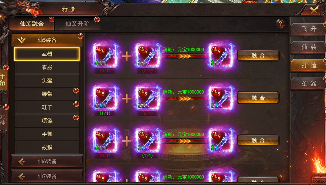 拥有了2个相同飞升属性的仙5装备我们就可以进行升阶成仙6装备,但从仙15之后就只有3条满属性的才能进行升阶。建议一开始就从3条满属性仙5合起,保证每阶战力都在最顶端。