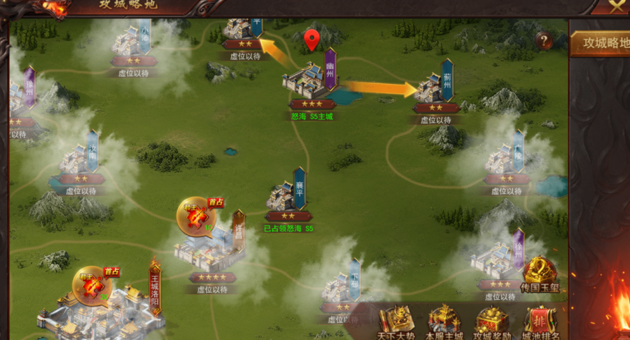 (3)玩家仅可选择与本服占领城池相邻的城池进攻可进攻的城池会由箭头标明(需要与主城连成一条线,若中间断开,也无法再往前攻打)