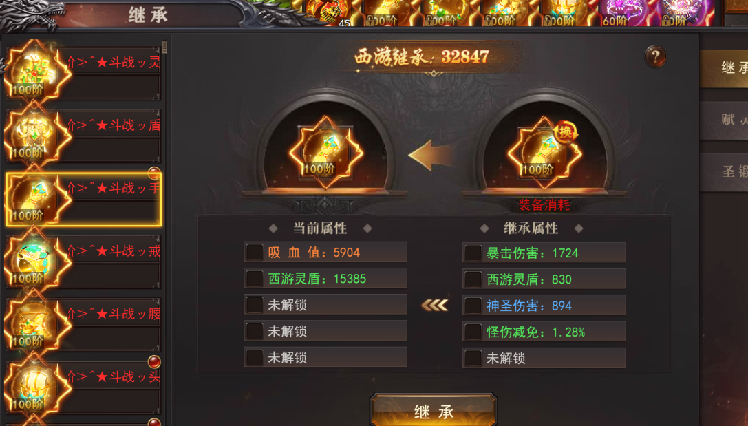 2.消耗100阶以上装备可以进行继承