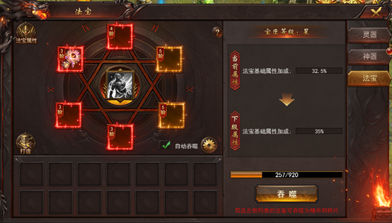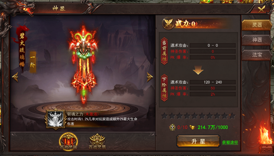 角色达到2转350级开启神器系统。神器系统分灵器(百战灵器,百战灵盾),神器(佛莲阵,神弓阵,天书阵),法宝。灵器使用百战灵器碎片,百战灵盾碎片以及元宝升星。百战灵器升星可获得神圣伤害和PK爆率;百战灵盾升星可以获得神圣免伤,死亡免爆的几率。