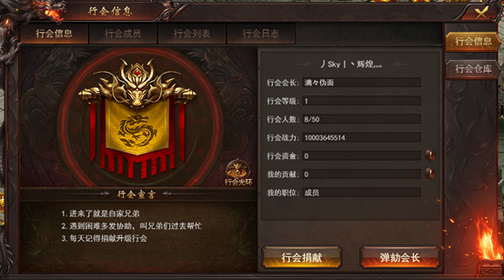 行会系统开启后玩家可创立行会,邀请各种大神组建一个强大的行会,一起击杀BOSS参与沙城争霸活动,行会成员可定时参与BOSS战、行会夺旗、沙城争霸等行会大型活动,不仅好玩还可获得丰厚的奖励。创建行会需要消耗钻石并达到创建条件(全民赞助10元,消耗388钻石)