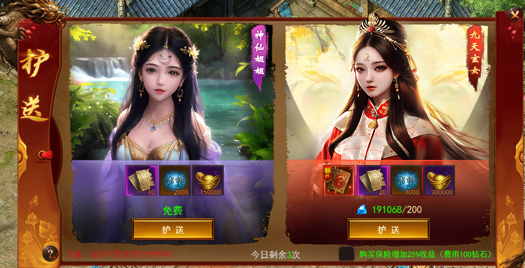 5. 购买保险,单次护送没有被劫镖,则单次可获得125%的押镖奖励。