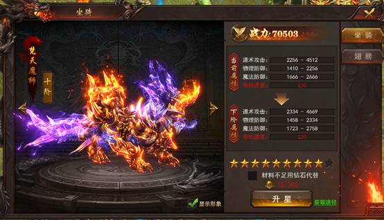 角色等级达到100级完成对应的主线任务激活坐骑系统,坐骑系统开启后玩家可野外地图使用坐骑遨游世界,使用坐骑后大幅提升移动速度。坐骑可以通过升星改变坐骑的外观形象,还可提升移动速度,并且大幅提升角色属性。坐骑升星需要消耗坐骑升阶丹。