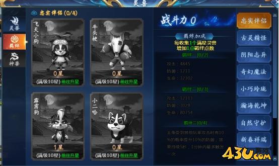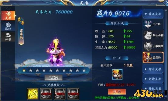 灵兽初始为零星,最大星级为十星。灵兽满星后,会获得1点羁绊点数,羁绊点数达到相应阶段可以激活对应属性加成以及特殊技能。