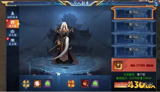 进入通天塔后可挑战每层BOSS,到达指定层数可获得神器碎片,每层通关也可获得神器进阶丹及经验。