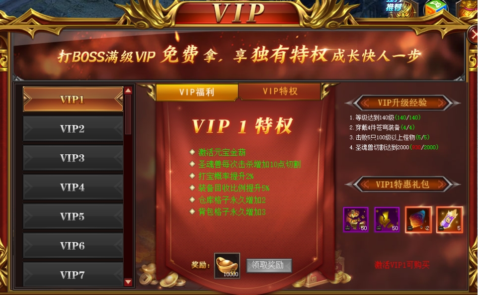 完成每级vip任务即可激活vip等级,享受各种vip特权,每个任务完成后还可领取大量元宝。提升打宝爆率、增加圣魂兽切割伤害、随身回收特权、背包、仓库格子等多种特权免费享受,快速入门升级必升系统。
