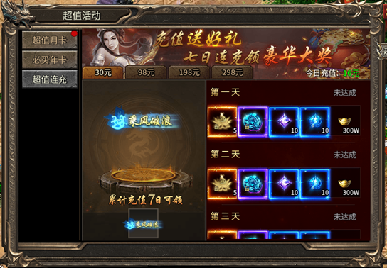 四,超值连充活动内容:活动时间内,7日连续充值对应金额可以领取相应奖励。