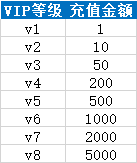 备注:VIP等级充值金额需叠加计算,如需要达到V3需要充值50+10+1总共61元