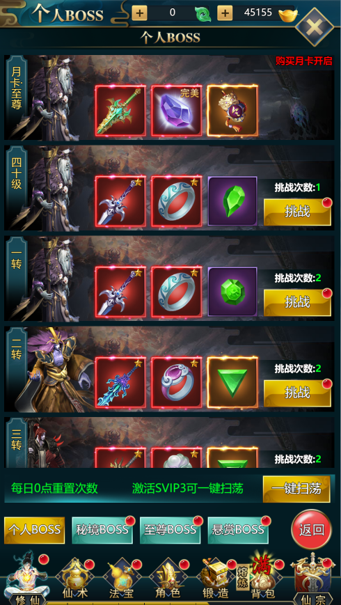 (3)至尊BOSS:本服多人boss,达到对应的转生等级和VIP等级才能进入,击杀boss后可获得大量优质奖励。