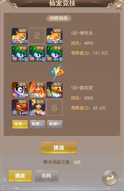 值得一提的是,作为进攻方我们是可以看到你选择的对手的仙宠、排位和技能的。这就是一个机会,让你通过制造出克制对手的布局去战胜对手!这可是战力与策略的最高挑战!用我们最爱的仙宠,去迎接最强大的对手,若胜利了那份满足感可是无可比拟的!这就是让人又爱又恨的仙宠竞技场!不过注意每天只能挑战6次仙宠竞技噢,若想继续需要通过购买次数实现。